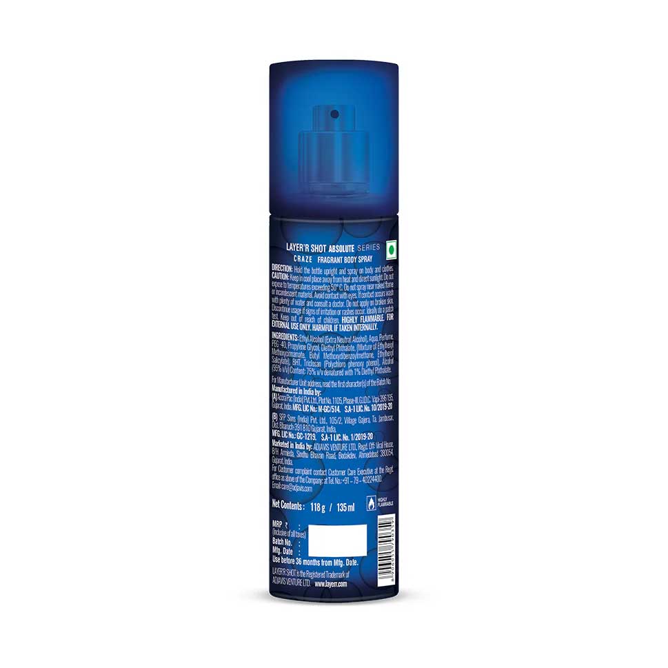 LaYer'r Shot Absolute Series Craze Deodorant Body Spray 135ml