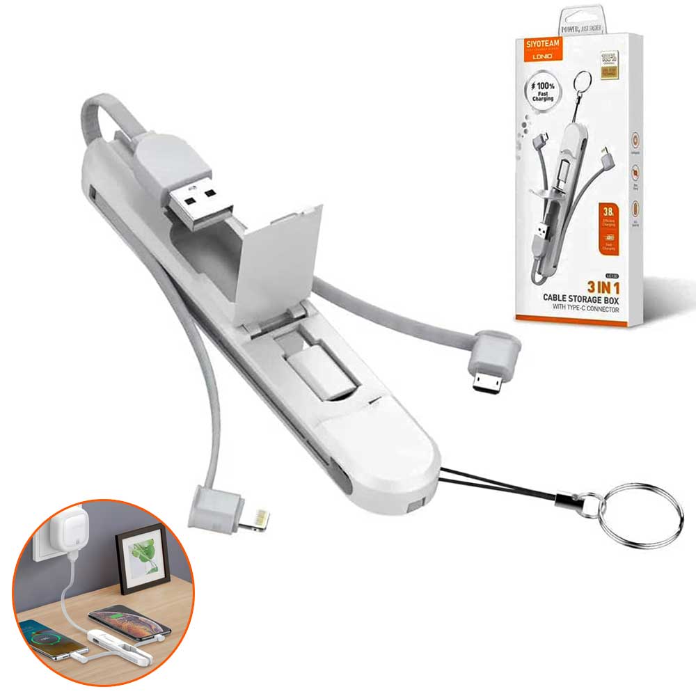 Buy LDNIO 3 in 1 Cable Storage Box with Type C Connector online in Bangladesh from Cellsii.com. Here is a 3-in-1 USB cable from LDNIO, made of high-quality materials that are safe for your phone and devices. It comes with a distinctive design in the form of a key holder for easy charging and data transfer effortlessly. Supports fast charging with a power of up to 3.8A. It also supports all ports Micro USB, IOS, USB- C at the same time.