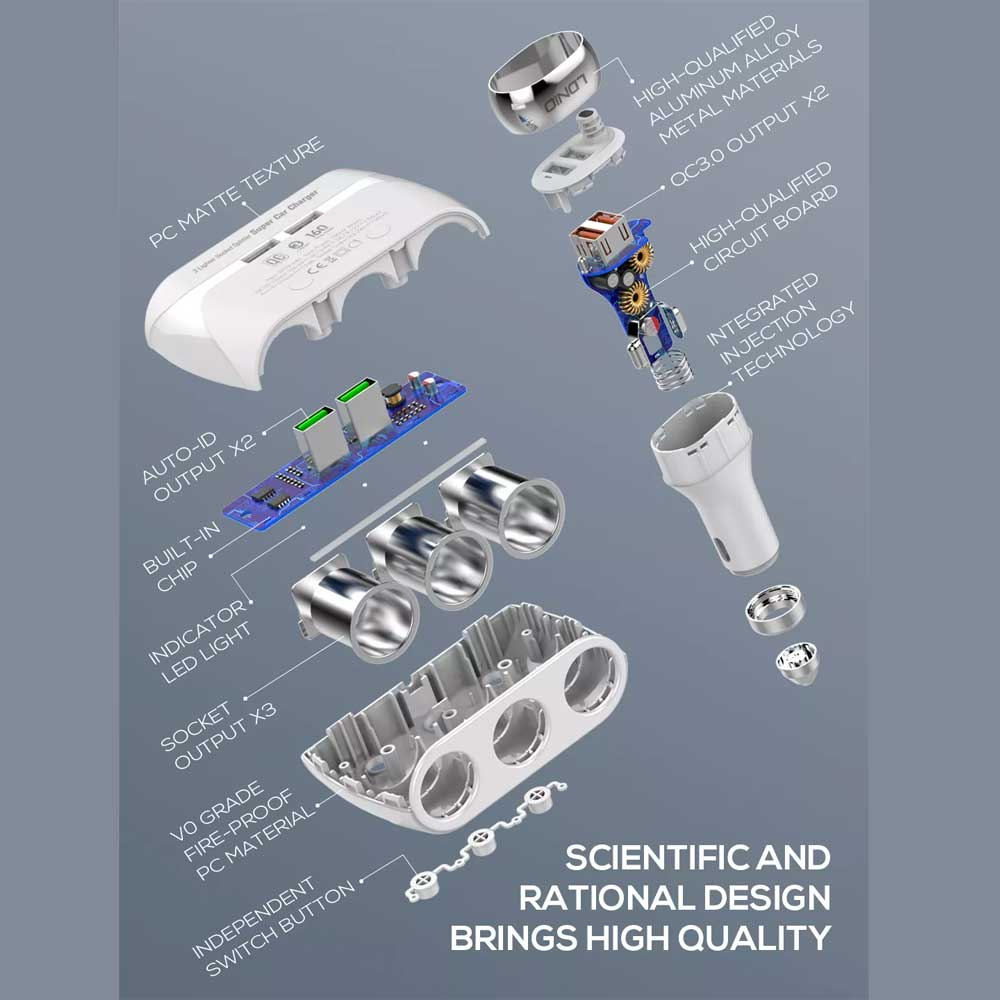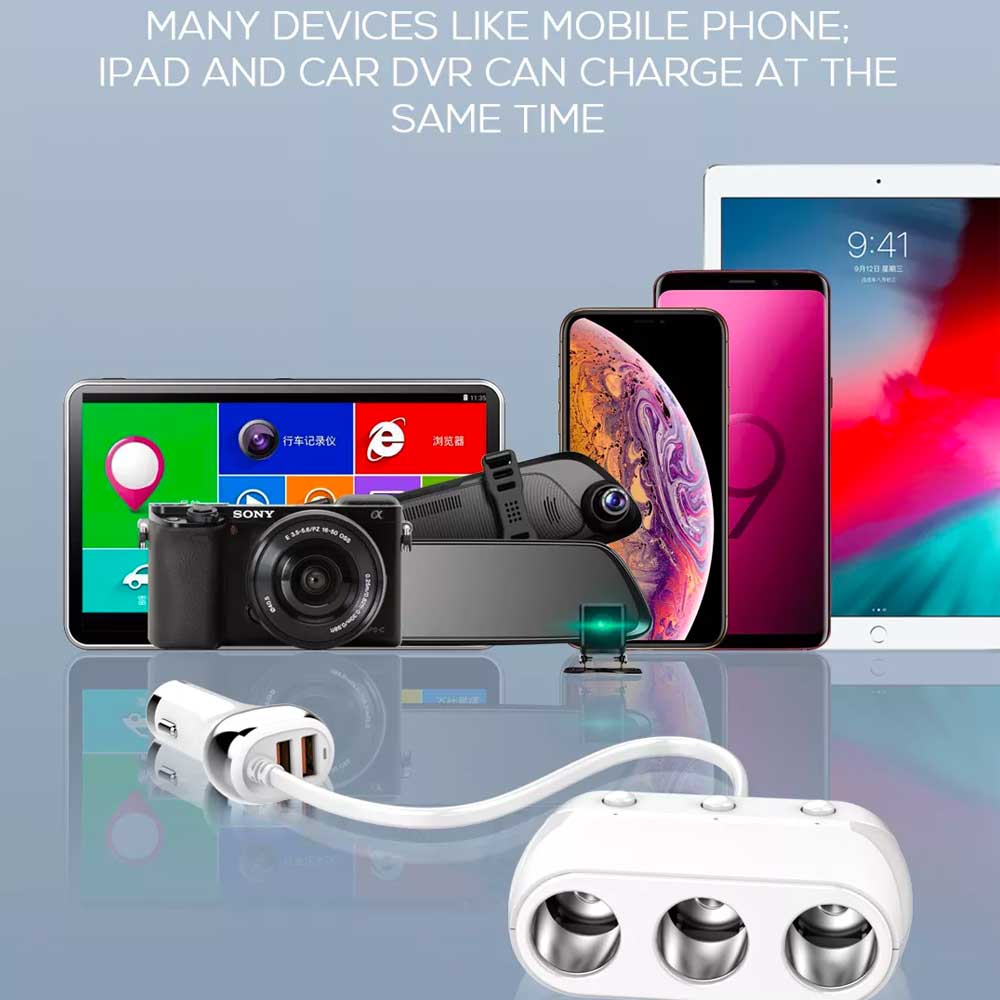 - Super car charger with 4 usb ports, 2 usb port is QC3.0 with 3 extension socket splitter.
