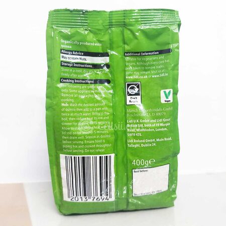 Buy LIDL organically produced white quinoa 400g online from Cellsii.com. Quinoa was last year's big health food buzz word and for good reason. Quinoa offers more fibre and protein than brown rice would and contains essential amino acids, such as lysine which helps to fight cold sores. Throw some cooked quinoa into a salad to bulk it up or pair it with a stew, pasta sauce or stir-fry. Some people even eat it for breakfast - add some chopped apple, cinnamon and nuts of your choice to make a healthy breakfast apple crumble.