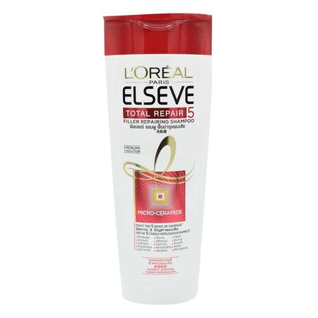 Buy L'Oreal Elseve total 5 filler repairing shampoo 330ml online from Cellsii.com. L’Oreal Paris total repair 5 shampoo helps repair the five visible signs of damaged hair split ends, weak, rough, dull and dehydrated. Our strengthening system with protein + ceramide helps fortify each strand, reinforcing hair fiber and sealing-in nourishment.