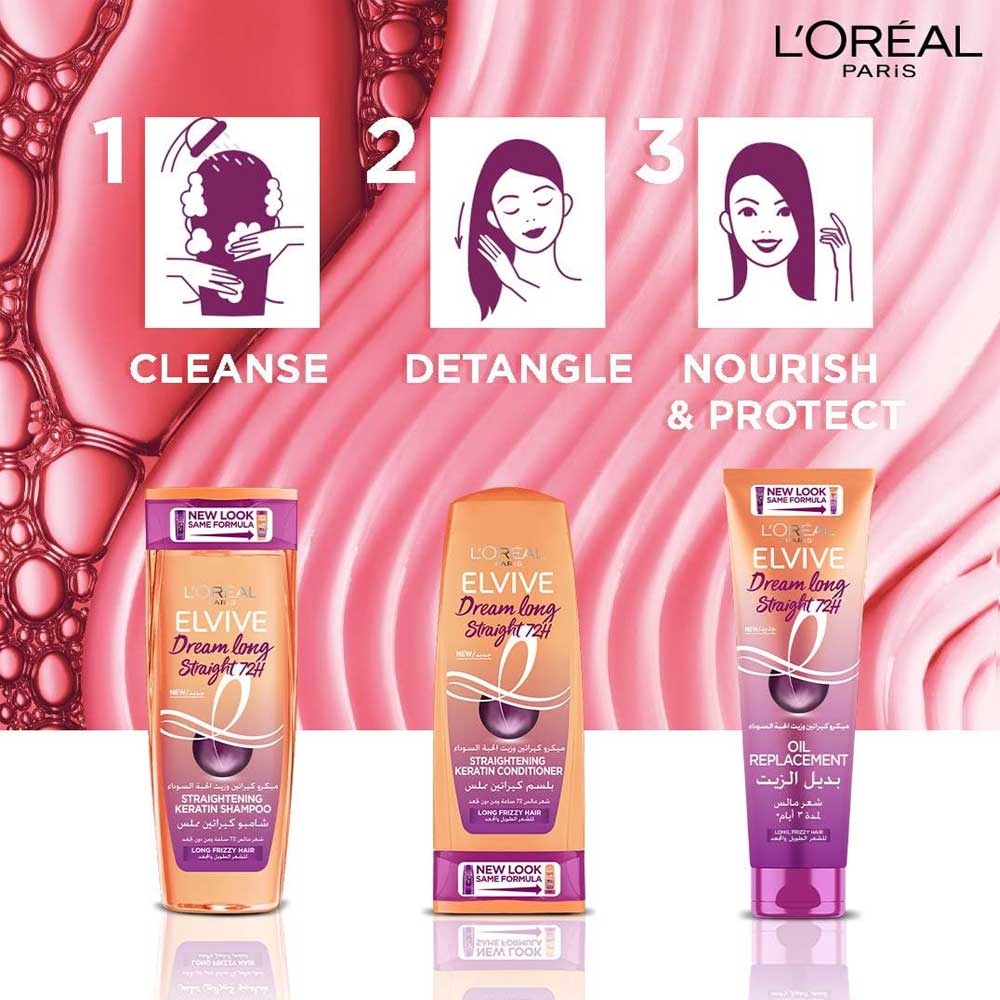 Buy L'Oreal Paris Elvive Dream Long Straight 72h Keratin Shampoo 400ml online from Cellsii. Give yourself the luxury of shiny, detangled locks with Loreal Paris Shampoo. This shampoo nourishes hair while sealing split ends in just one use. It adds a sweet, fruity fragrance to hair, enhancing shine and elasticity.