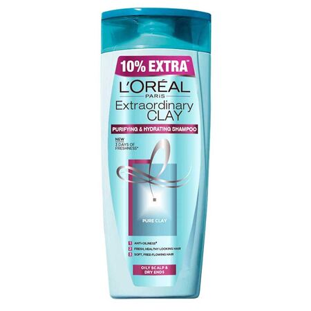 Buy L'Oreal Paris extraordinary clay shampoo 175ml online from Cellsii.com. This is ultra purifying washes off excess oil on scalp, roots, and helps eliminate impurities and pollution particles. Intensely hydrating moisturizes from lengths to tips for hydrated free flowing hair, leaving hair fresh for up to 72 hours.