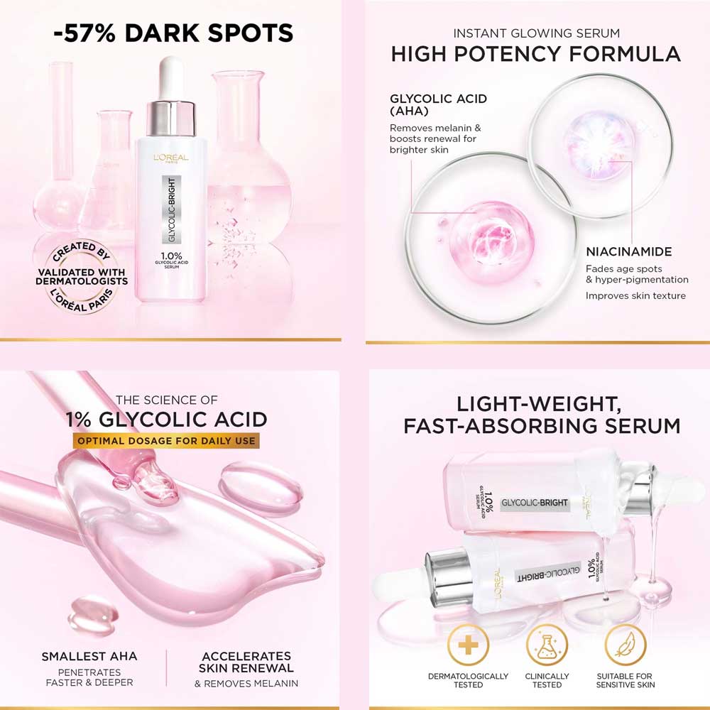 Buy L'Oreal Paris Glycolic Bright Skin Brightening Serum 15ml online in Bangladesh from Cellsii. The L'Oreal Paris Glycolic Bright Skin Brightening Serum is a high-performance facial treatment designed to enhance skin radiance and clarity. It contains glycolic acid, a powerful exfoliant that helps to remove dead skin cells and reveal a brighter, more even complexion.