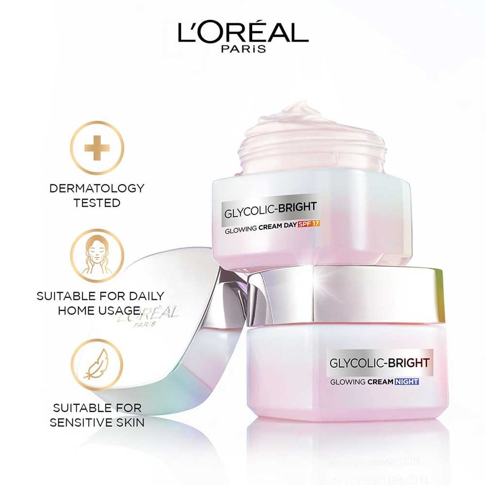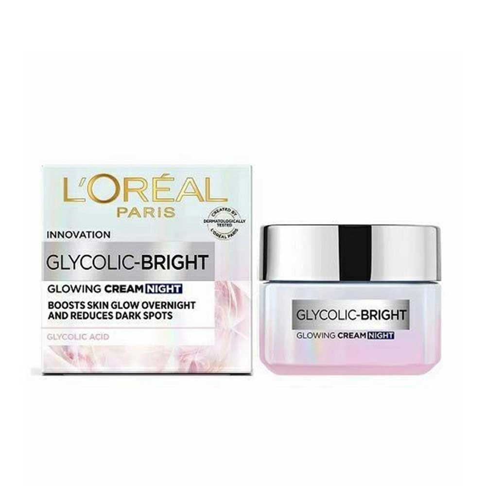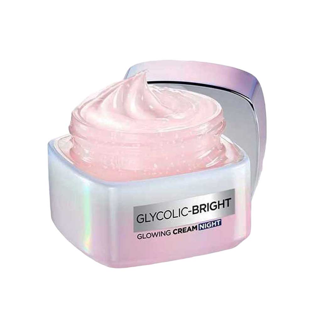 - The L'Oréal Glycolic Bright night cream gives you nourished and glowing skin.