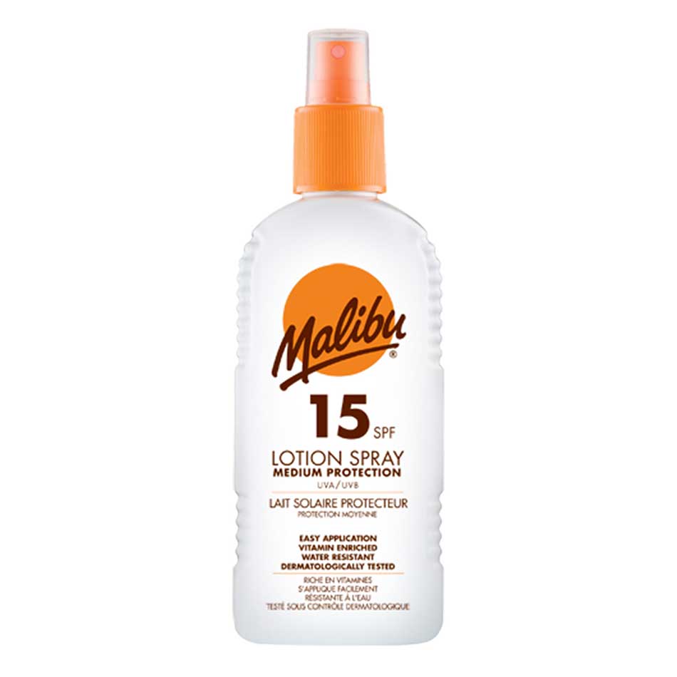 Buy Malibu SPF15 Lotion Spray 200ml online from Cellsii.com. Malibu sun cream water-resistant Malibu guaranteed Sun lotion with SPF 15 one long-lasting protection. The Lotion contains vitamin E and vitamin B5 and protects against UVA and UVB rays. Application: Before sunbathing generously and evenly apply small amounts significantly reduce the protection.