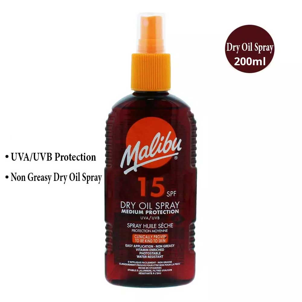 - Build a bronzed glowing tan with Malibu’s dry oil tanning spray. Protect your skin against harmful and damaging UV rays with a medium SP factor 15.