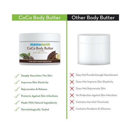 Buy Mamaearth CoCo Body Butter with Coffee & Cocoa 200g online from Cellsii.com. It’s time to fall in love with your skin all over again with Mamaearth CoCo Body Butter. Loaded with the goodness of Coffee, Cocoa, Sunflower Seed Oil and Shea Butter, this body butter is all you need for keeping dryness away and moisture intact. Thanks to its high content of fatty acids and antioxidants, our CoCo Body Butter combats free radicals, which cause dullness, darkening, and wrinkles.