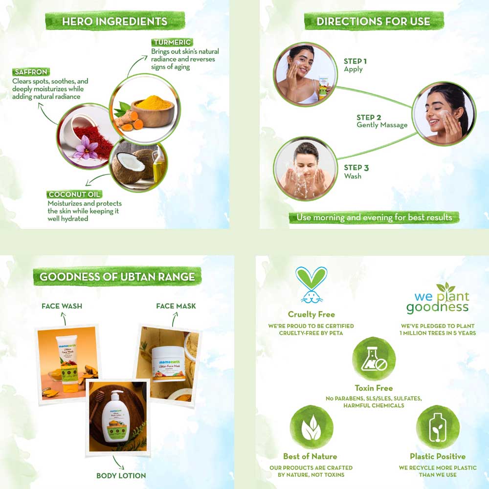 - Regular use of this face wash can help achieve a natural, healthy glow due to the nourishing properties of turmeric and saffron.