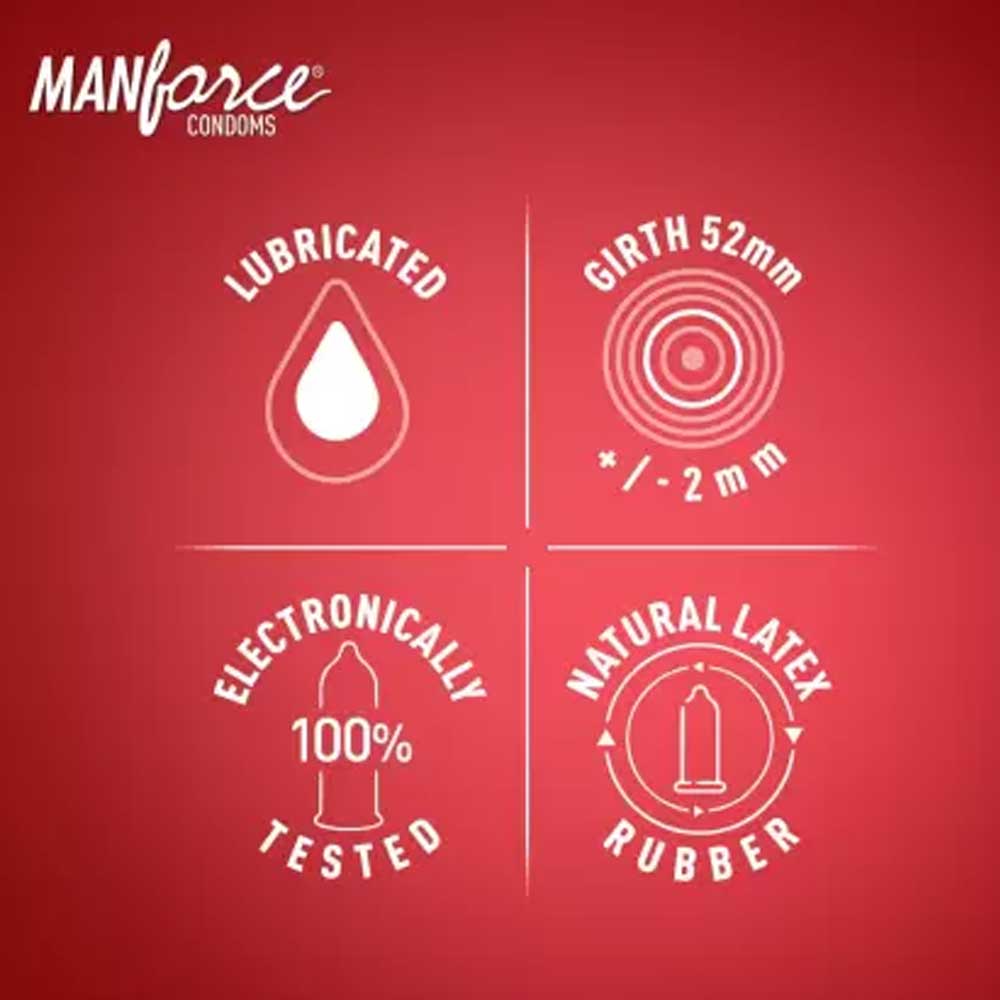 - Manforce condoms have a girth of 52 mm +/-2mm and length of 180 mm.