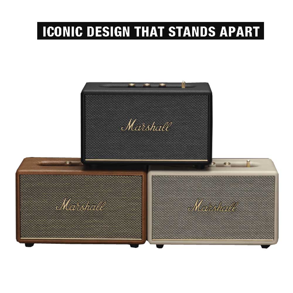 - Iconic design: Marshall has taken its signature rock ’n’ roll home speaker line-up and given it a stripped-back look that makes a loud statement. Its iconic design knocks all other speakers off the shelf. Signature details such as the Marshall script and brass control knobs adorn the speaker, echoing the legacy of rock ’n’ roll. Choose the finish that fits you – original Black, vintage Cream or relaxed Brown.