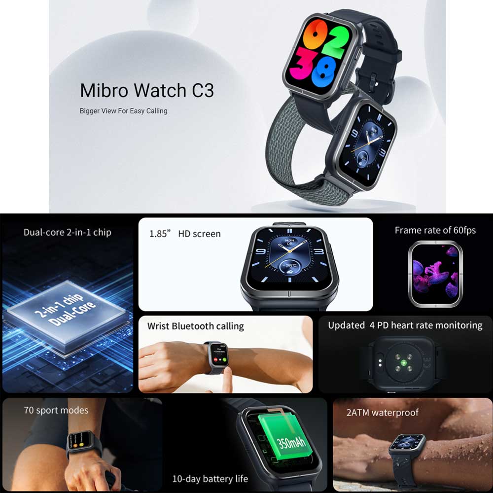 This Mibro C3 smart watch from Xiaomi eco brand supports HD Display 1.85 inch big screen with Bluetooth calling system & 10 day battery life in daily mode. Enjoy a stunning high-definition display for a superior visual experience. Benefit from a smooth and fluid display with a 60Hz screen refresh rate. It's easily switchable between dynamic dials with a touch on the screen and explore more options in the Mibro Fit App.