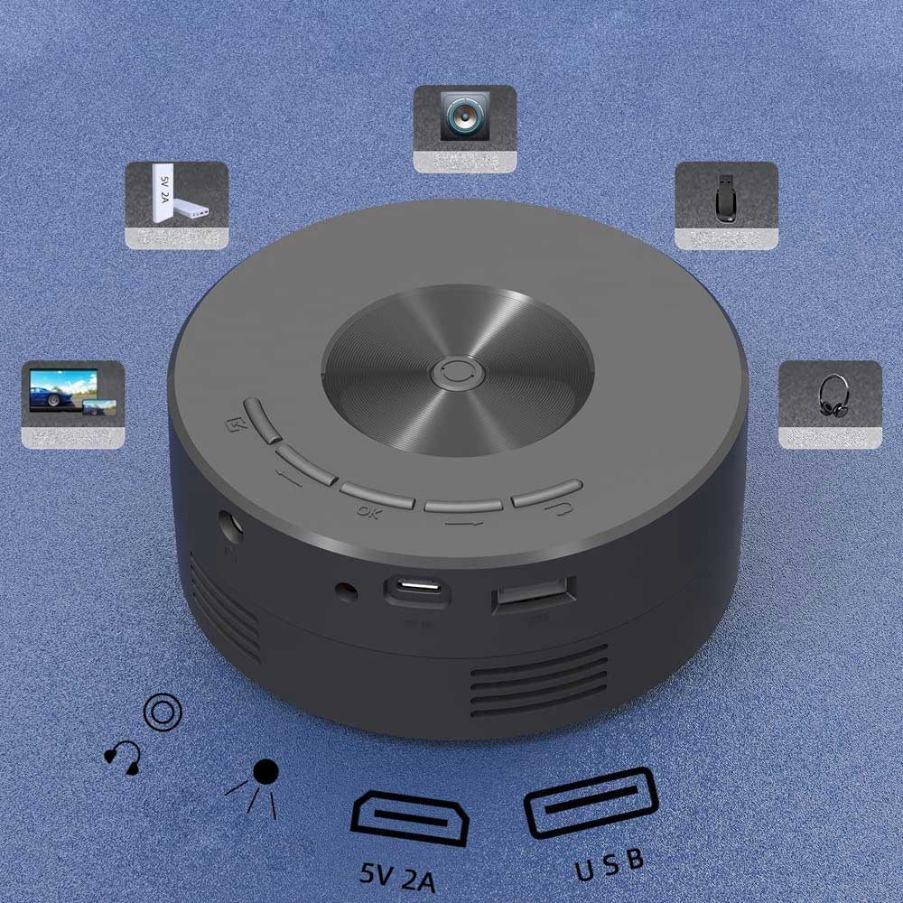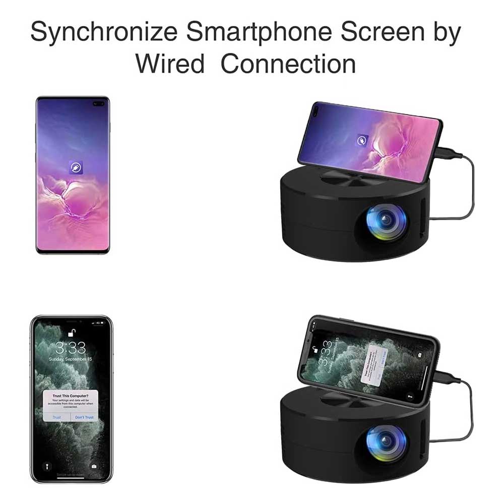 - Wire screen mirroring, use smartphone data cable to connect with projector to realize screen mirroring function, support both iOS and Android system. Built-in 4Ω2W speaker, and also can connect with 3.5mm headphones or stereo.