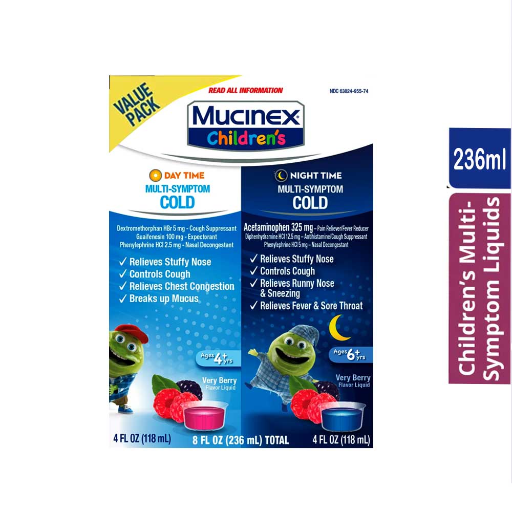 Buy Mucinex Children's Cold Multi-Symptom Relief Daytime & Nighttime 236ml online from Cellsii.com. Mucinex Children’s day time multi- symptom cold and night time multi-symptom cold are multi-symptom relief medicines for your child’s cold symptoms. Mucinex Children’s Day Time Multi-Symptom Cold helps control cough, relieves stuffy nose, chest congestion and thins and loosens mucus.