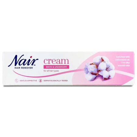 Buy Nair Bikini & Underarm Hair Removal Cream 90ml online from Cellsii.com. Nair Bikini & Underarm Hair Removal Cream gently yet effectively removes unwanted hair from the delicate underarms and bikini area. The dermatologically tested formula contains moisturising cotton seed oil to care for your skin whilst removing hair, leaving skin silky-soft.