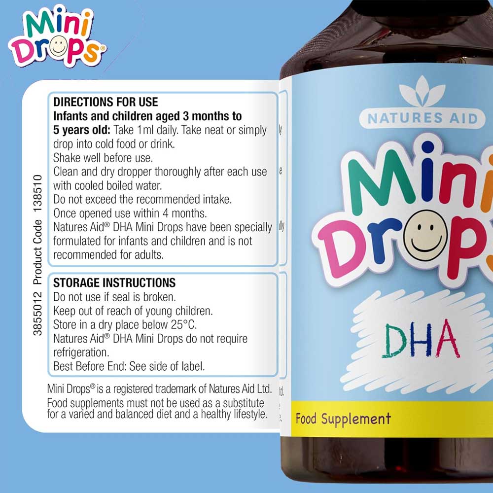 Infants and children aged 3 months to 5 years old: Take 1ml daily. Shake well before use. Clean and dry dropper thoroughly after each use with cooled boiled water. Do not exceed the recommended intake. Once opened use within 4 months. Natures Aid DHA Mini Drops have been specially formulated for infants and children and is not recommended for adults.
