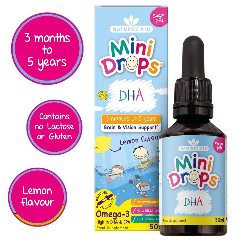 Buy Natures Aid Mini Drops DHA Omega-3 Lemon Flavour 50ml online in Bangladesh from Cellsii.com at the best price. Mini Drops DHA (Omega-3) is a carefully formulated liquid health supplement designed to support brain and vision development in babies and young children aged 3 months to 5 years. Each 1ml serving delivers 500mg Omega-3 of which 350mg of DHA and 100mg of EPA (DHA and EPA are two essential Omega-3 fatty acids known for their role in cognitive function and eye health).