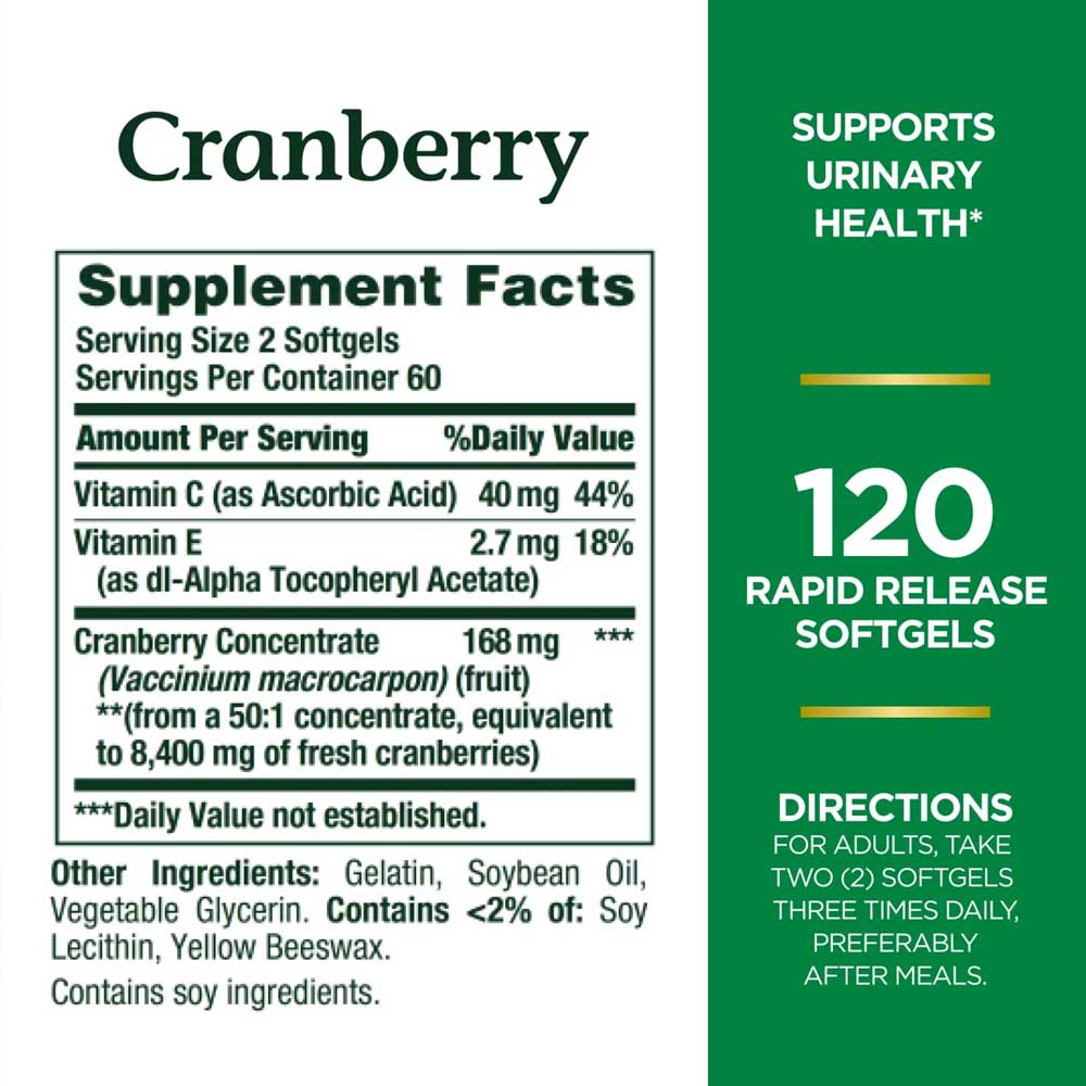 - Made using cranberry concentrate, each serving Nature’s Bounty Cranberry with Vitamin C softgel contains the equivalent of 4,200 mg of fresh cranberries, along with 40mg of Vitamin C and 2.7mg of Vitamin E.