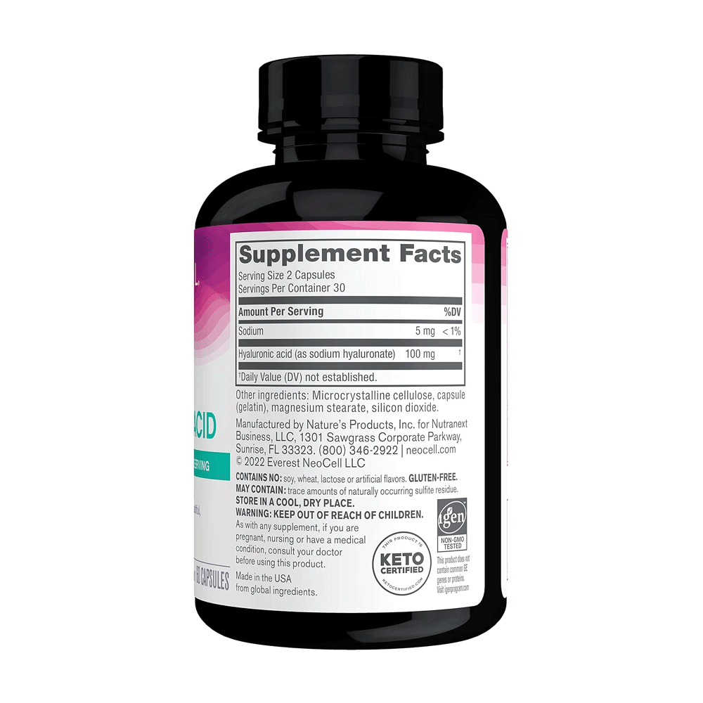 - NeoCell Hyaluronic Acid capsules are gluten free, keto certified and paleo friendly.