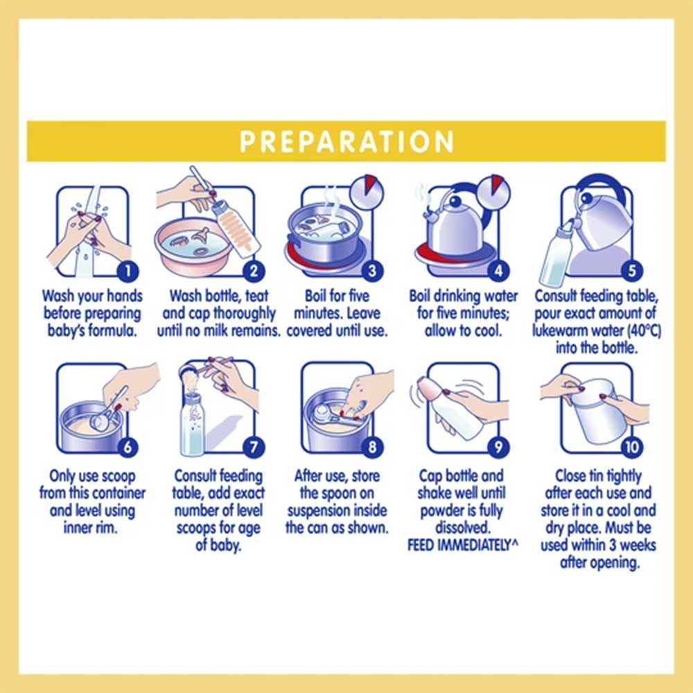 - Follow preparation instructions exactly. Prepare bottles and teats as directed. Do not change proportions of powder except on medical advice. Incorrect preparation can make your baby very ill.