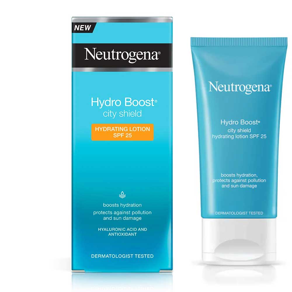 - Neutrogena Hydro Boost City Shield Hydrating Lotion SPF 25 boosts hydration and strengthens the skin’s defences.