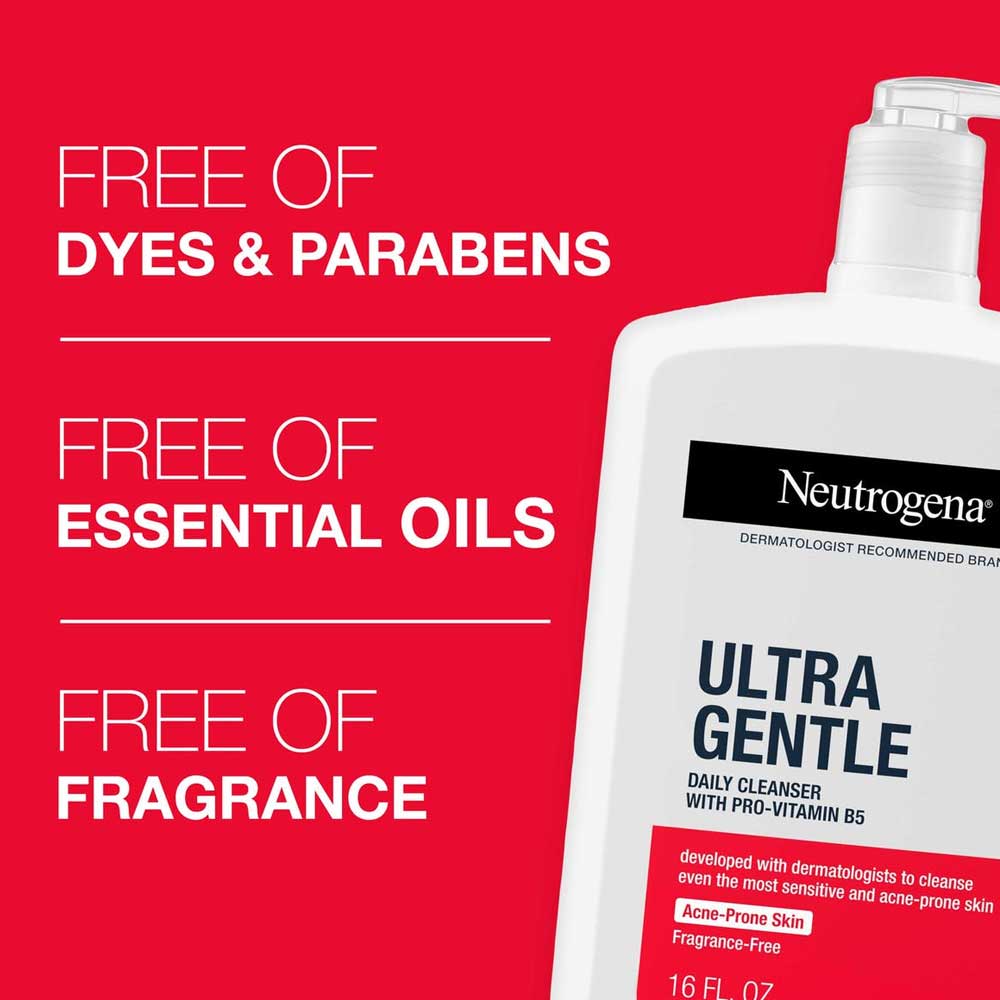 - 16-fluid ounce bottle of Neutrogena Ultra Gentle Daily Cleansing Face Wash for acne-prone and sensitive skin that gently, yet effectively, cleanses skin thoroughly to help remove excess oil, dirt, bacteria and makeup.