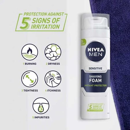 Buy Nivea Men Sensitive Shaving Foam 200ml online from Cellsii.com. Nivea Men Sensitive Shaving Foam instantly protects your skin from the five most common signs of shaving irritations. Those include redness, tightness and micro cuts. The shaving foam with Chamomile and Vitamin E softens the beard hair – for an especially close and ultimately smooth shave.