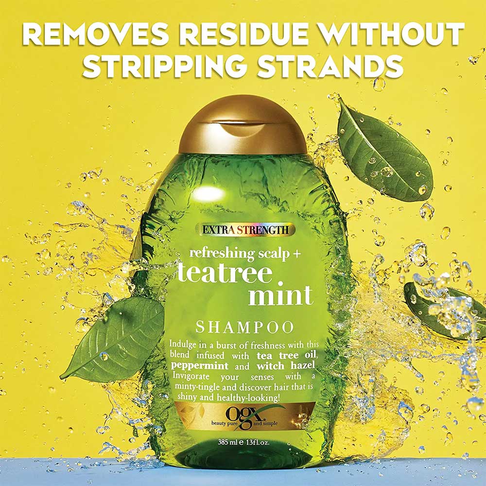 Buy OGX Refreshing Scalp + Tea Tree Mint Shampoo 385ml online in Bangladesh from Cellsii.com. Deeply cleanse your tresses with a burst of freshness! Infused with tea tree oil, peppermint and witch hazel, the new OGX Extra Strength Healthy Scalp + Teatree Mint Shampoo. This invigorating and lightweight shampoo helps remove buildup and leaves your scalp tingly and happy and your hair shiny and healthy-looking.