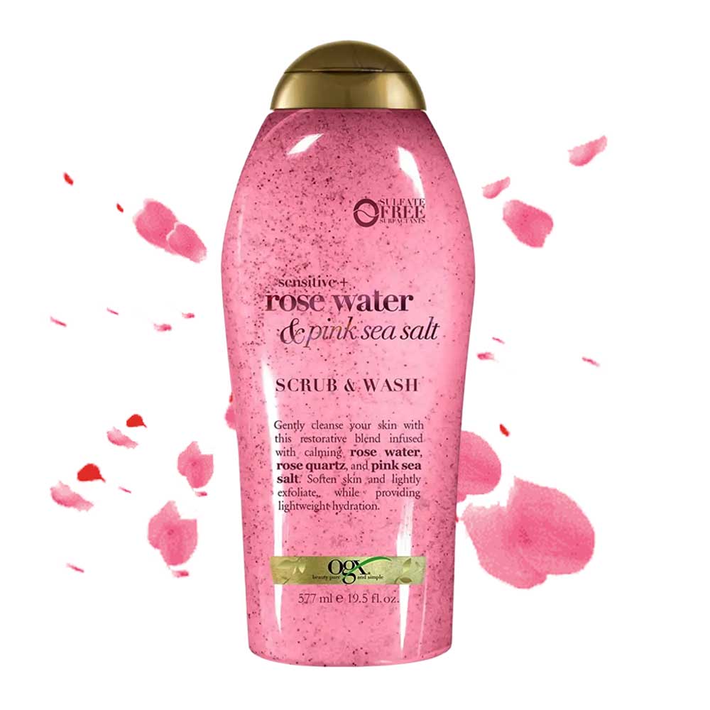 - Gently exfoliate and nourish skin with OGX Rosewater & Pink Sea Salt Wash & Scrub, featuring calming rosewater and lightly buffing sea salt.