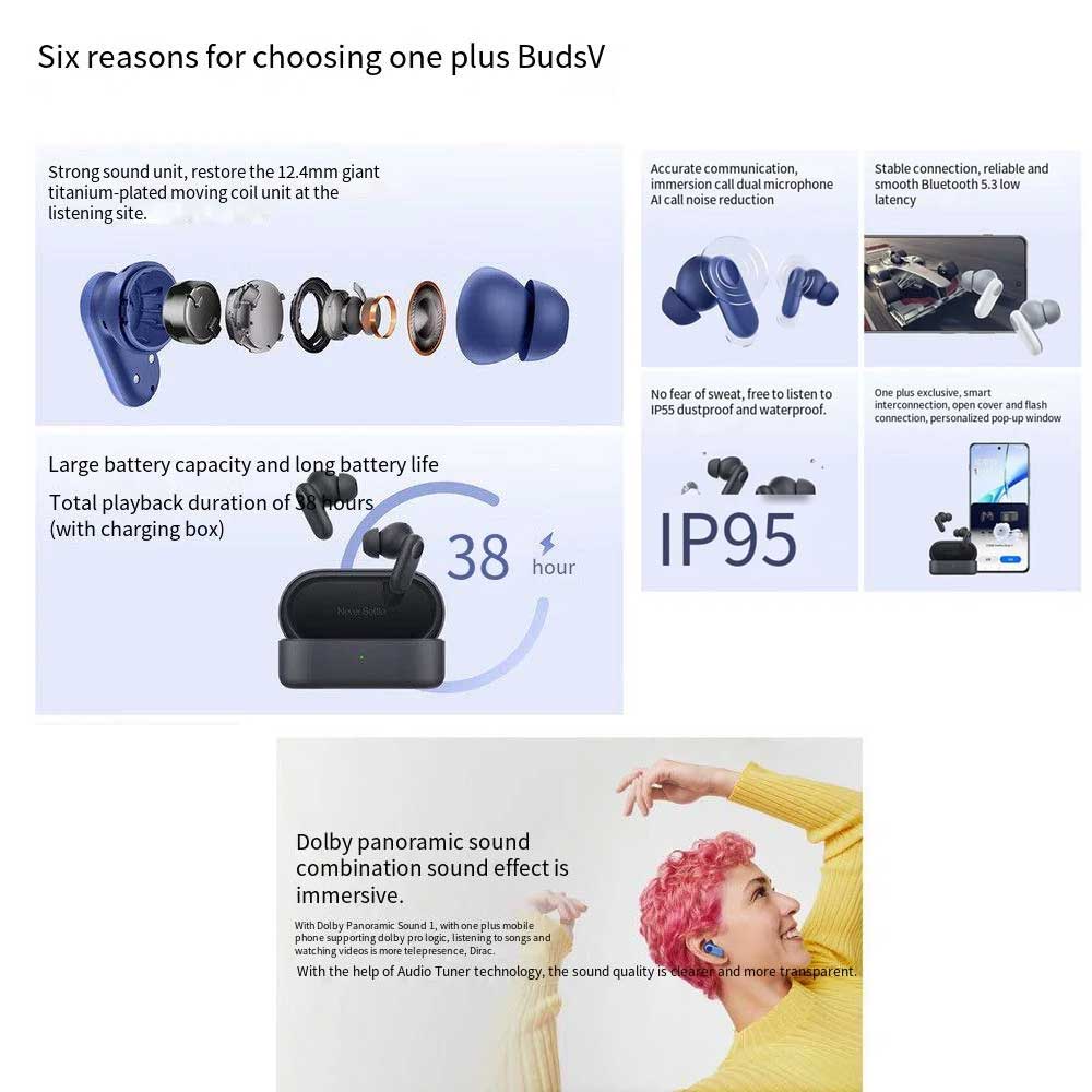 - With Bluetooth 5.3 connectivity and a low latency of 94ms, the OnePlus Buds V ensures a seamless wireless experience. The earbuds weigh just 4.3g each and offer intuitive touch controls for managing music playback, calls, and more.