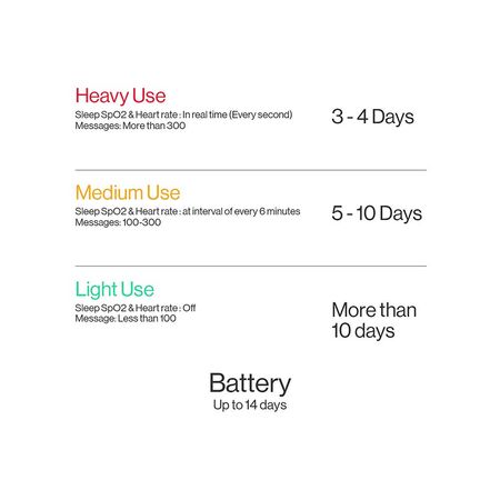 - Battery life: Up to 14 days