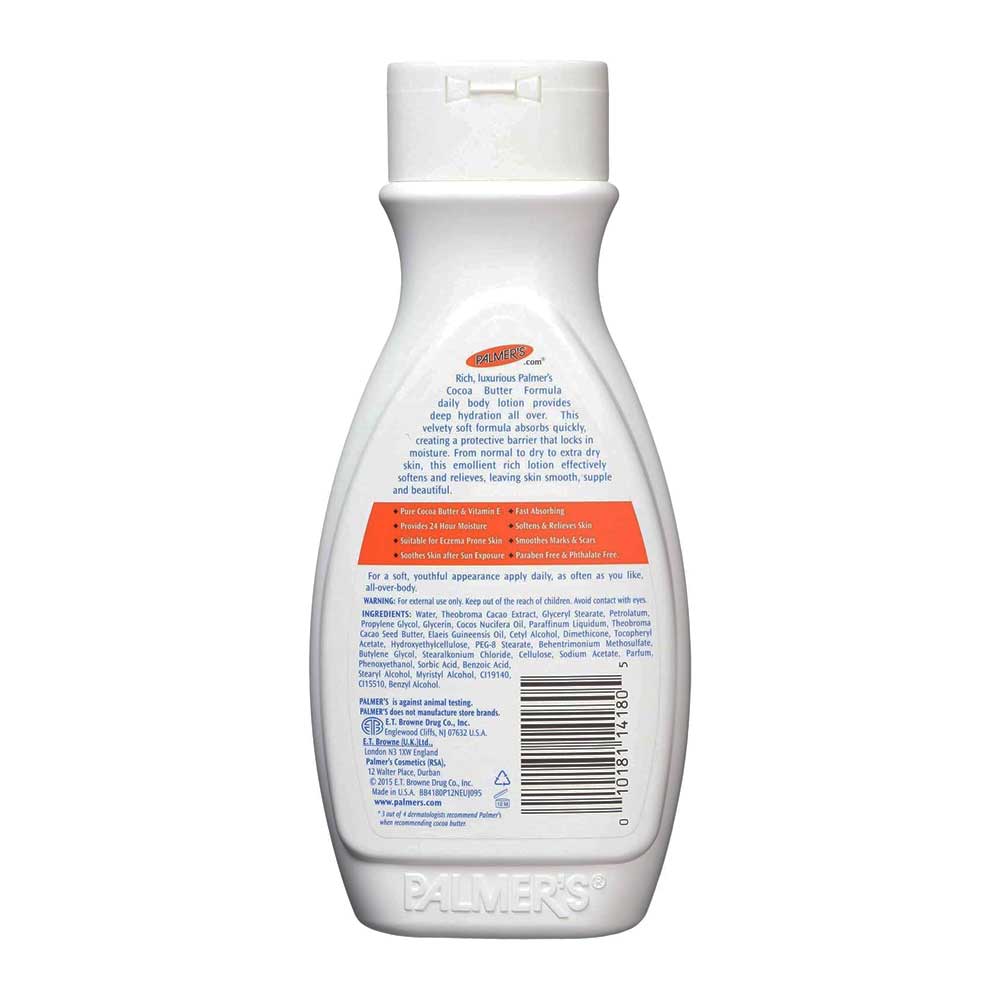- The lotion is also free from parabens, phthalates, and other harsh chemicals, making it safe and gentle for all skin types. One of the key benefits of using Palmer's Lotion, Cocoa Butter 350ml is that it helps to improve the appearance of scars, stretch marks, and other skin imperfections.