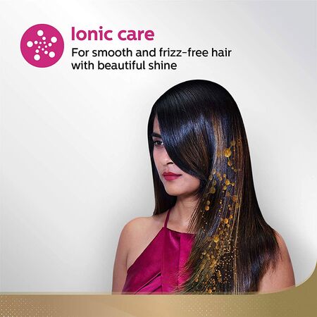 - More care with ionic conditioning for shiny, frizz-free hair: Give your hair instant care with ionic conditioning. Charged negative ions eliminate static, condition your hair, and smooth the hair cuticles to intensify shine and glossiness. The result is smooth and frizz-free hair with beautiful shine.
