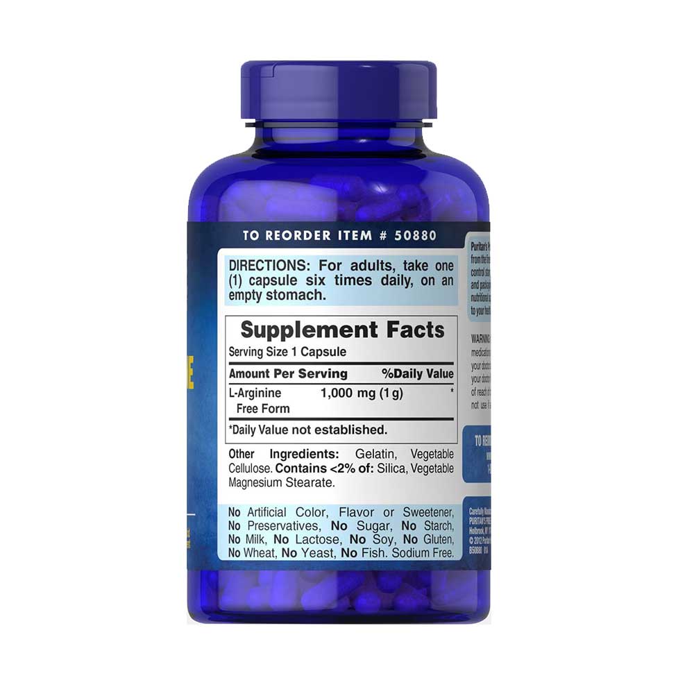- Puritan’s Pride L-Arginine 1000mg Capsule is a premium dietary supplement that comes in a convenient bottle of 100 capsules.