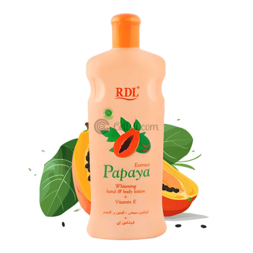 Buy RDL Papaya Extract Whitening Hand and Body Lotion 600ml online from Cellsii. RDL Papaya Extract Whitening Hand and Body Lotion is a skin-nourishing formula enriched with natural papaya extracts. Known for its effective whitening properties, this lotion helps in lightening the skin tone, reducing dark spots, and evening out discoloration. The creamy texture is quickly absorbed by the skin, leaving it soft, smooth, and hydrated throughout the day.