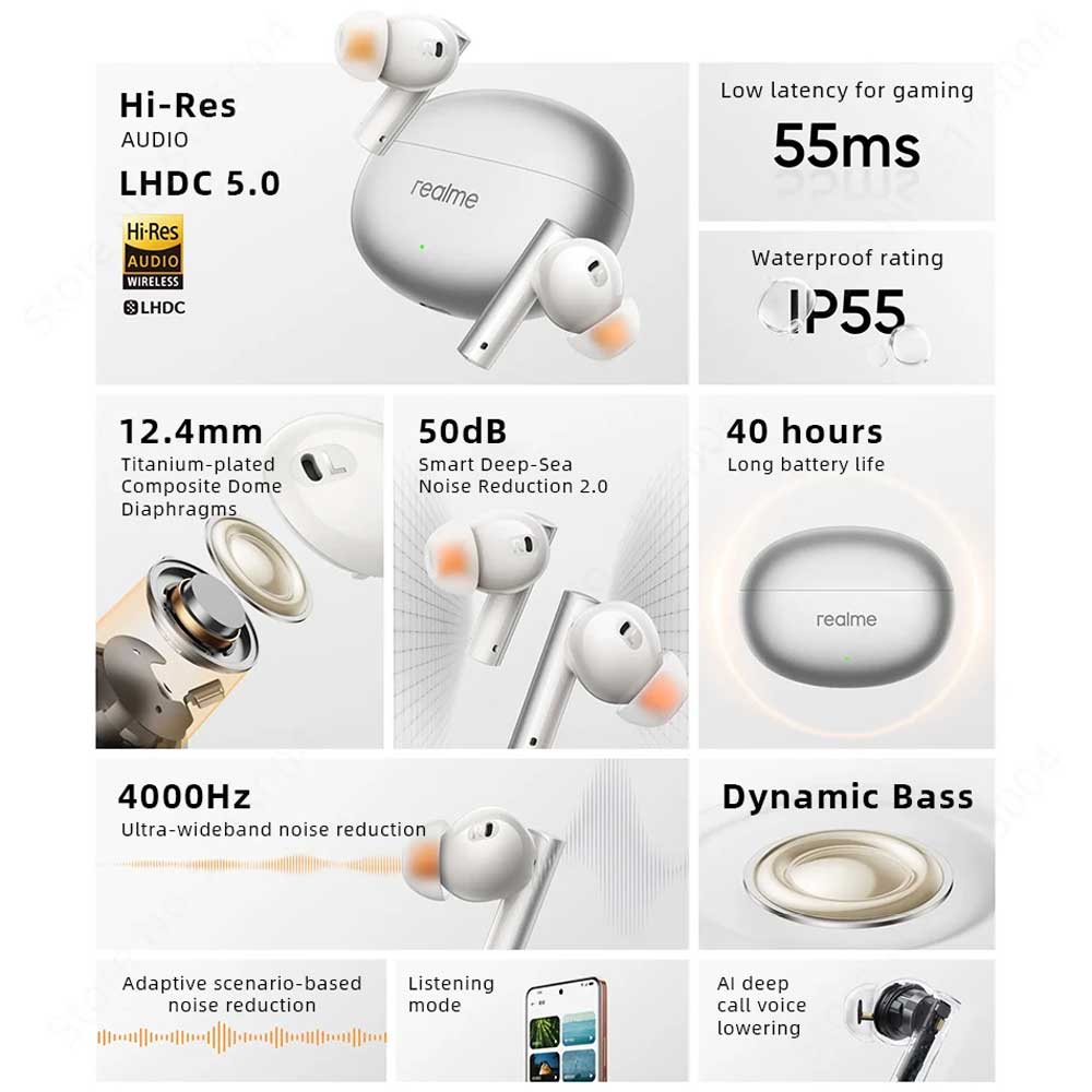 Shop online in Bangladesh, buy Realme Buds Air 6 from Cellsii.com at best price. The brand new Realme Buds Air 6 features a 12.4mm dynamic unit with titanium coating and Bluetooth v5.3 for connectivity. Audio features supported by the headphones include LHDC, AAC, SBC, Hi-Res Audio and LHDC 5.0.