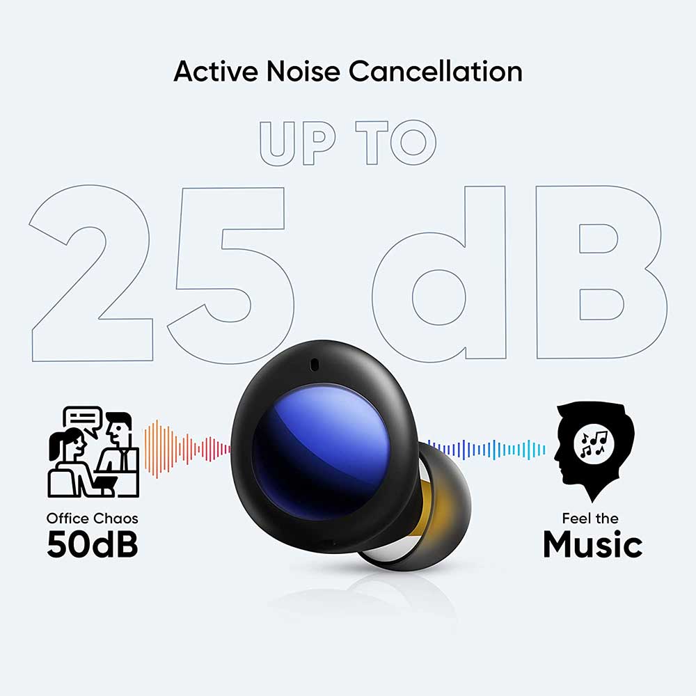 - Active Noise Cancellation (up to 25dB) reduces the external noise giving a premium, rich and immersive listening experience with deep bass