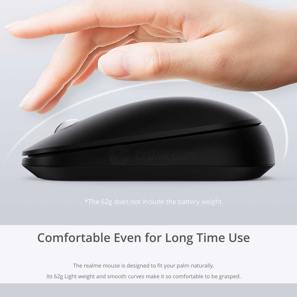 - Realme Wireless Mouse is an ergonomic design, full fit palm amplitude, 62g (not including the battery) lightweight, comfortable to use.