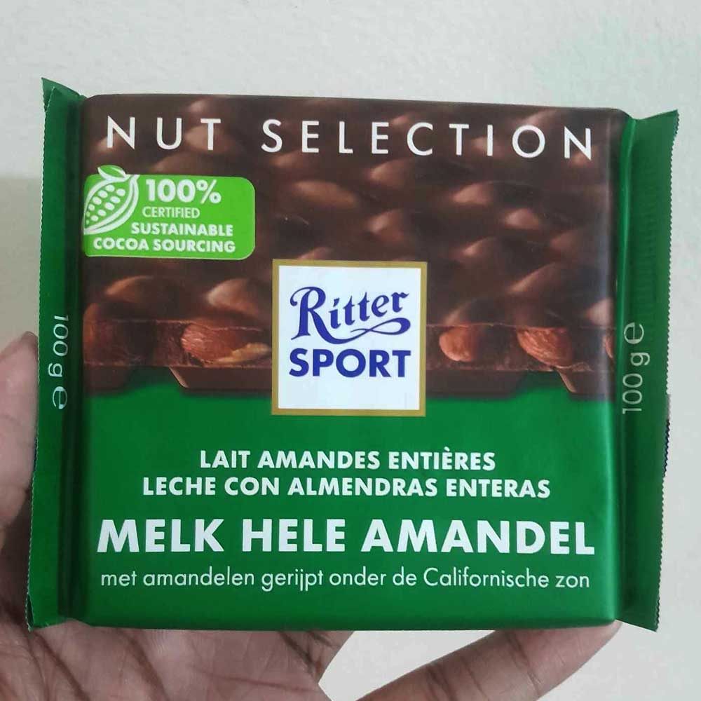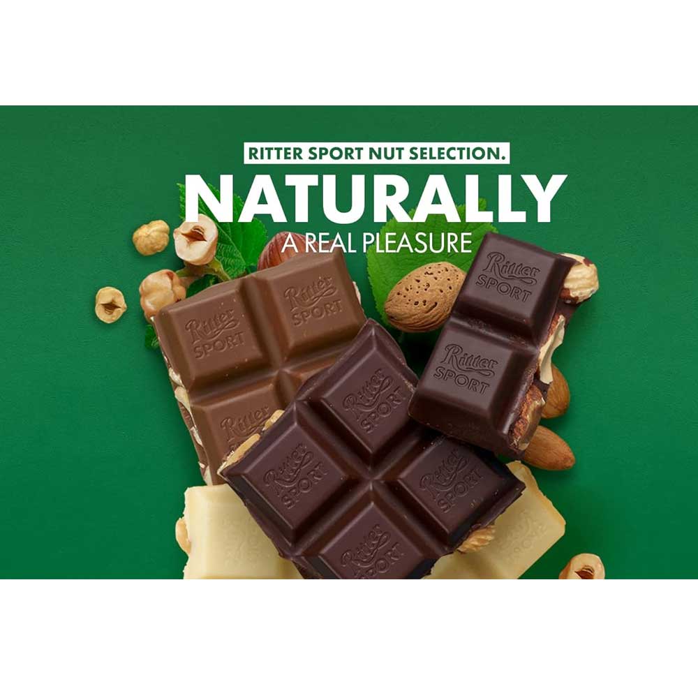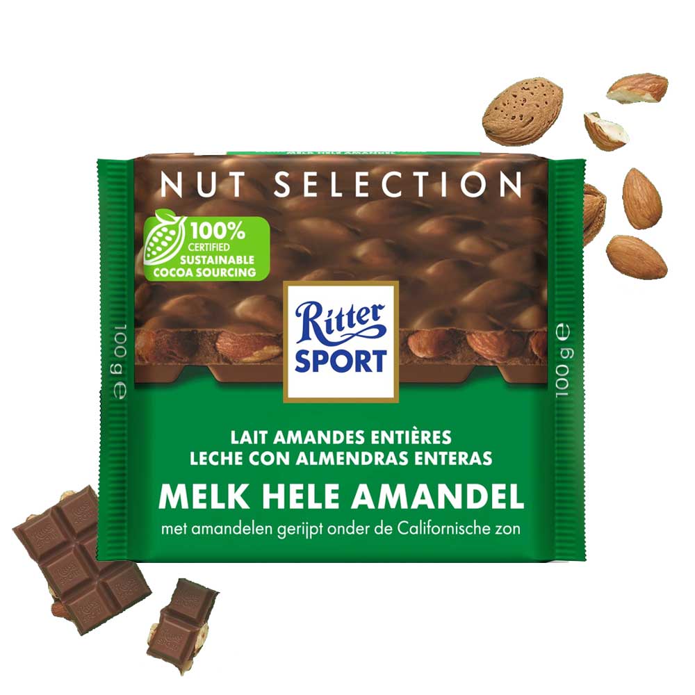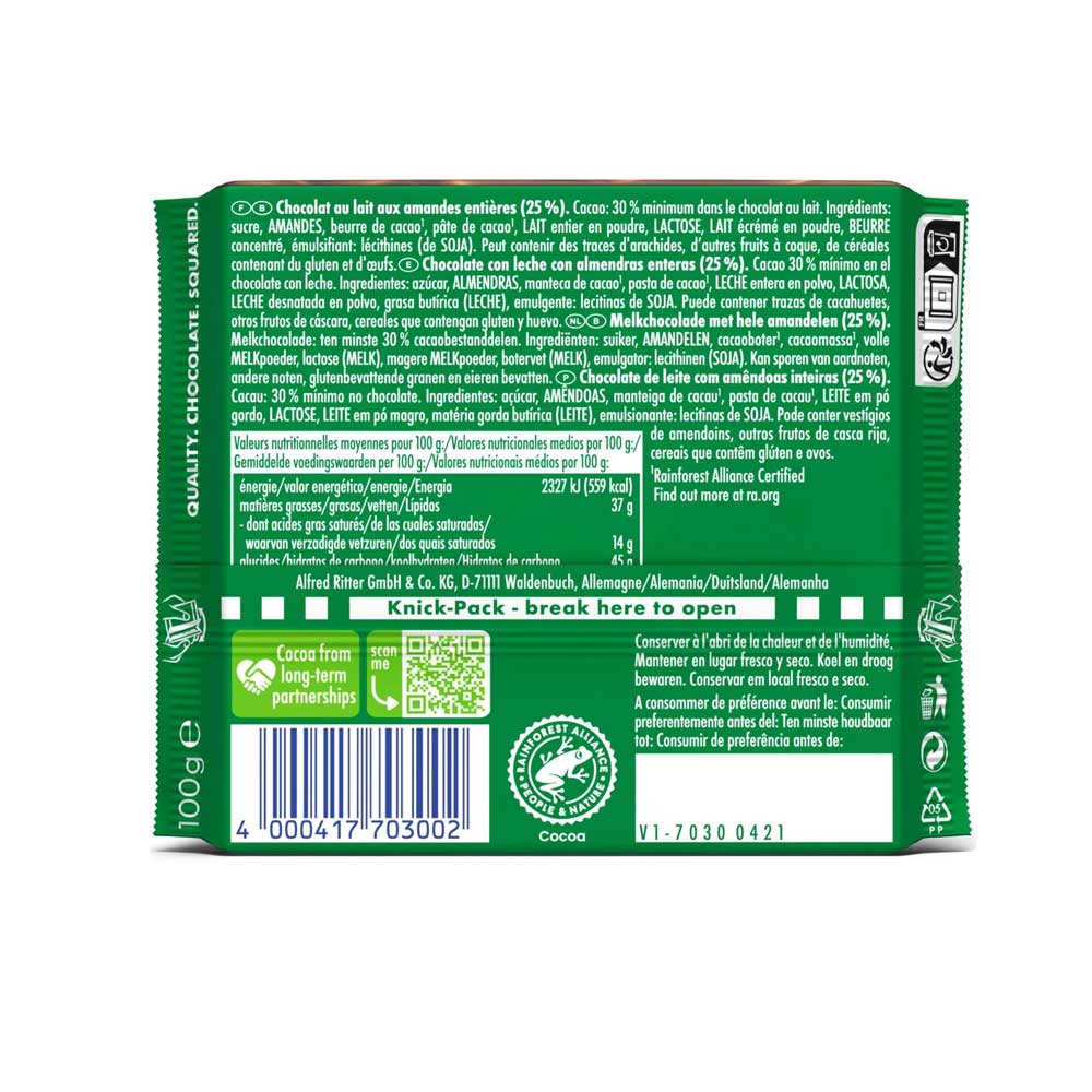 - Ritter Sport milk chocolate contains 25% roasted, whole almonds.