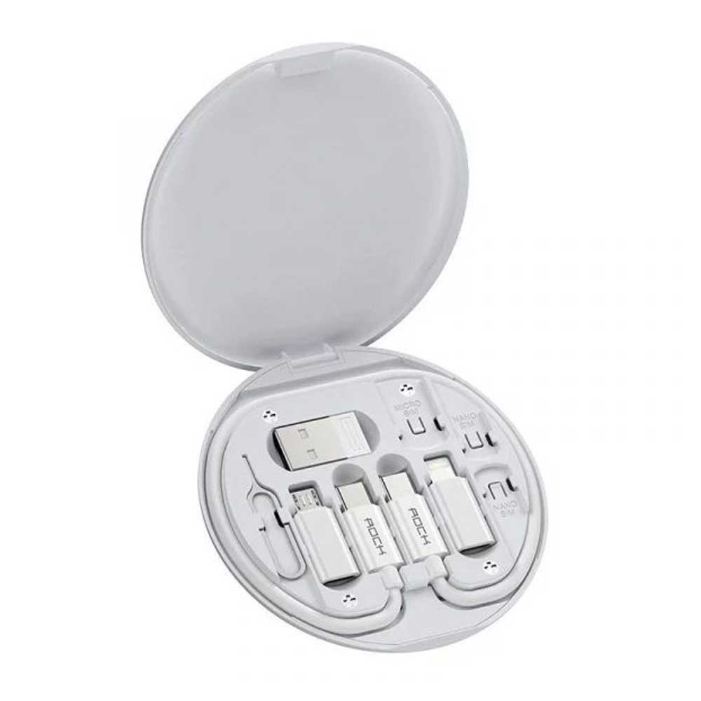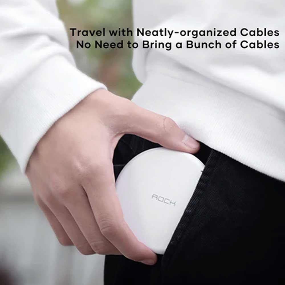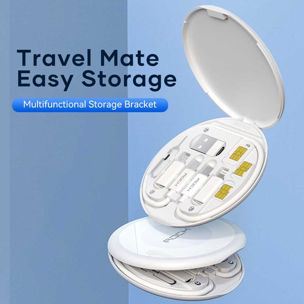Buy Rock Travel Mate Easy Storage Multifunctional Bracket online from Cellsii.com. This Mini Digital Gadgets Storage Box comes with 4 different ports including Android, lightning, USB, and TYPE C, which can be converted to each other, charged, transferred, etc. It also has a built-in phone stand for convenient video watching. It is mini and portable, you can carry it around for worry-free travel!