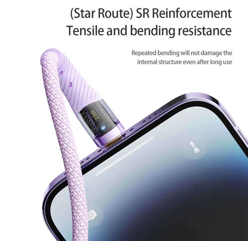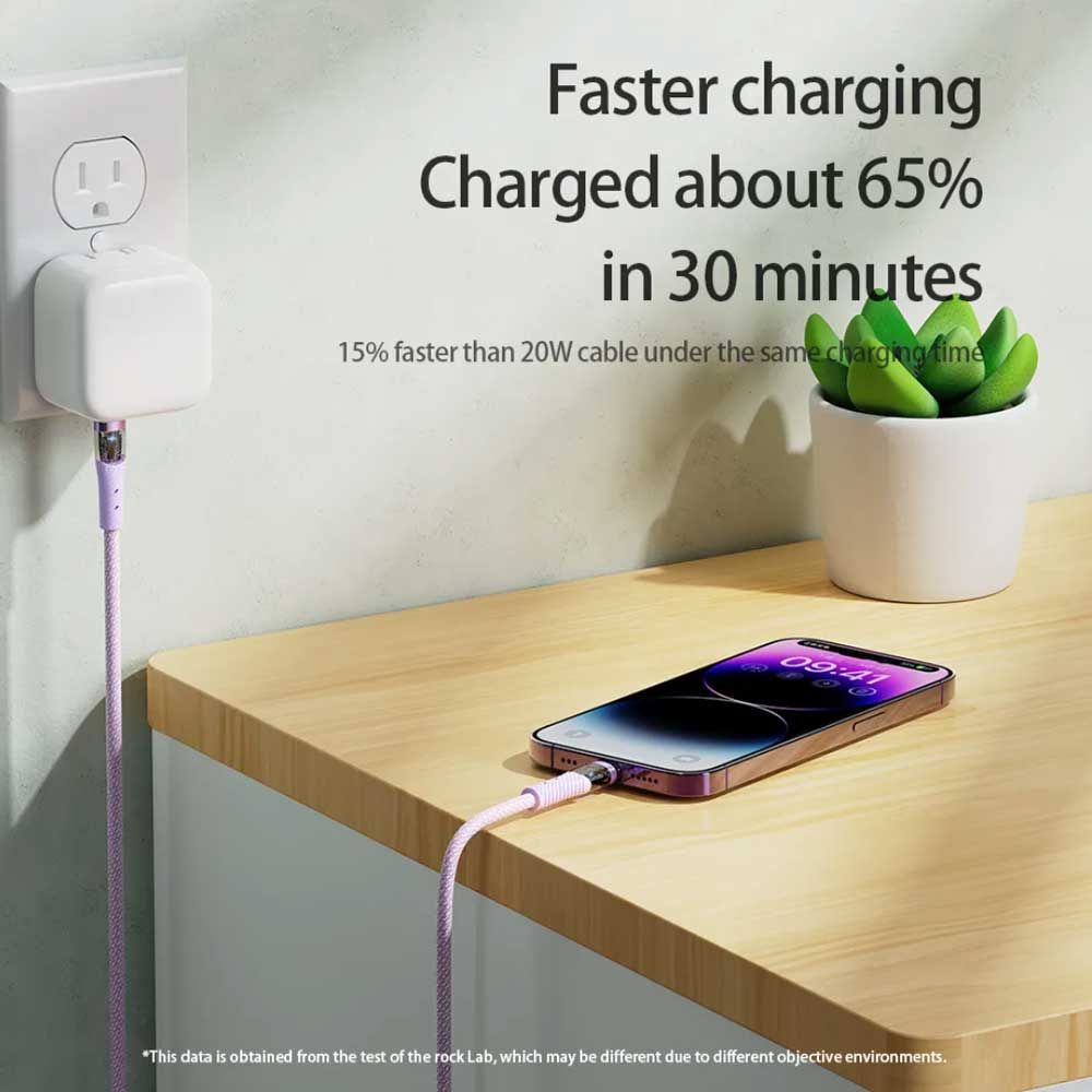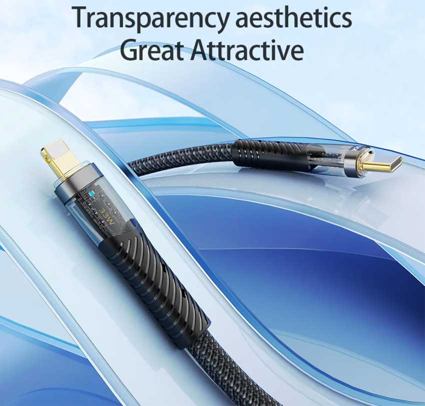 Buy Rock Z21 PD 33W Transparent USB-C to Lightning Fast Charge Data Cable online in Bangladesh from Cellsii.com. The combination of transparent case and andicator light makes each charging an aesthetic display. Support the 27W/20W fast charging of all iPhone 14 series downward compatible with fast charging of all iPhone 13/12/11 and below models. 15% faster than 20W cable under the same charging time.