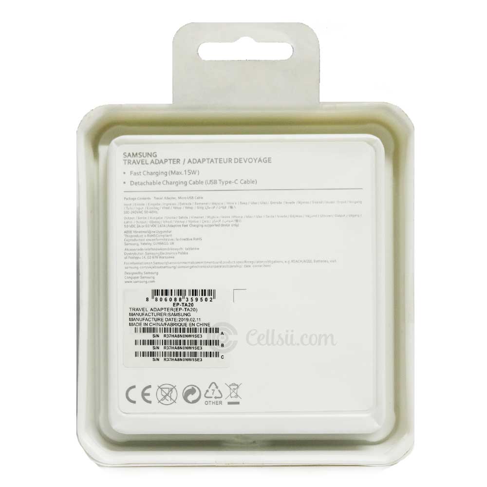 Buy Samsung 15W fast charging travel adapter with type C cable online from Cellsii.com. The Samsung Flat TA charger can be used across regions despite the various electrical currents. Just plug it into an outlet using the appropriate plug adapter.