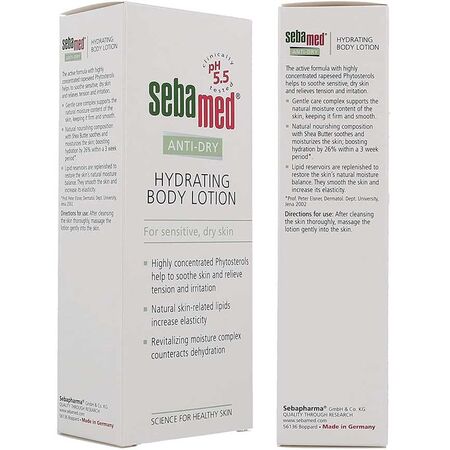 Buy Sebamed anti dry hydrating body lotion for sensitive dry skin 200ml online from Cellsii.com. Boosting hydration by 26% in just 3 weeks, Sebamed anti-dry hydrating body lotion regenerates dry skin conditions, increasing skin’s moisture content and restoring lipid balance. Rapeseed phytosterols protect against (and relieve) itching, roughness, tension and burning sensations, as well as skin redness.