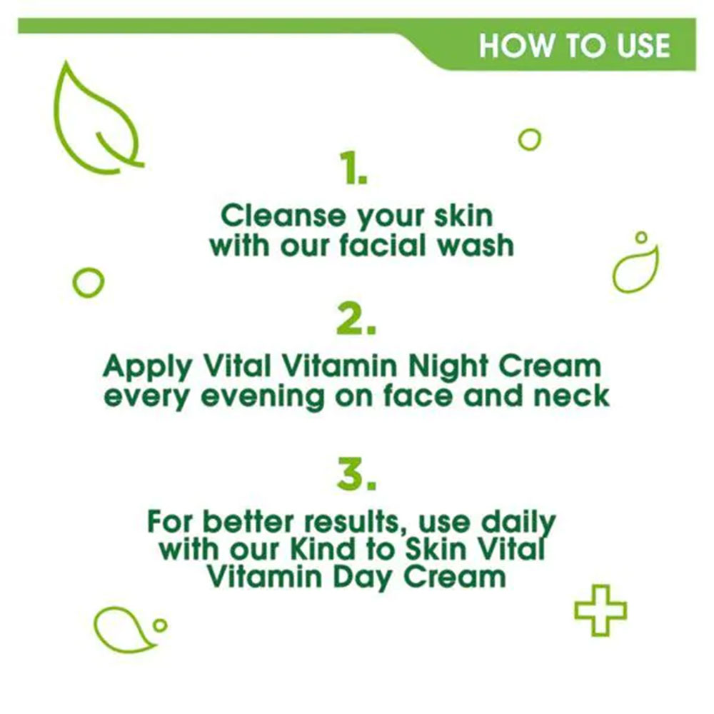 - Vital Vitamin Night Cream contains Pro-Vitamin B5, Vitamin E, Glycerin and Bisabolol, which help to keep your skin moisturised and replenished.