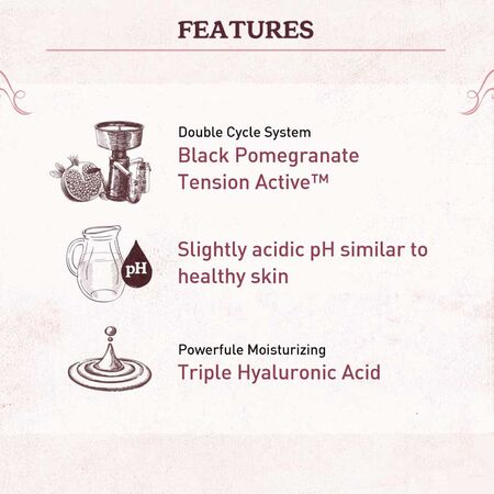 - Fully extracted ellagic acids through double extraction and oncentration of black pomegranate: Firms up the skin with Black Pomegranate Tension Active extracted through the Double Cycle System.