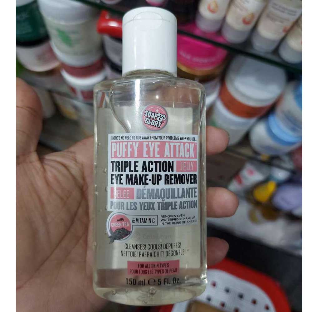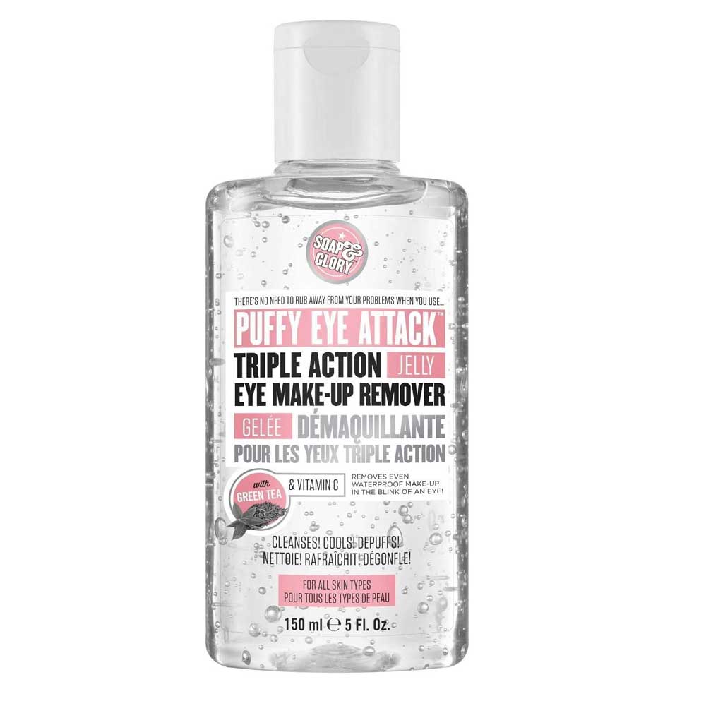Buy Soap & Glory Puffy Eye Attack Jelly Makeup Remover 150ml online from Cellsii.com. Now you can believe your eyes! Puffy Eye Attack Triple-Action Eye Make-Up Remover Jelly helps to melt away even the most stubborn eye make-up without leaving any telltale residue. Infused with everyone's favourite antioxidants, Green Tea and Vitamin C, and suitable for even the most sensitive of skin, the jelly-like texture gently cleanses, calms and cools, for perfectly de-puffed peepers.