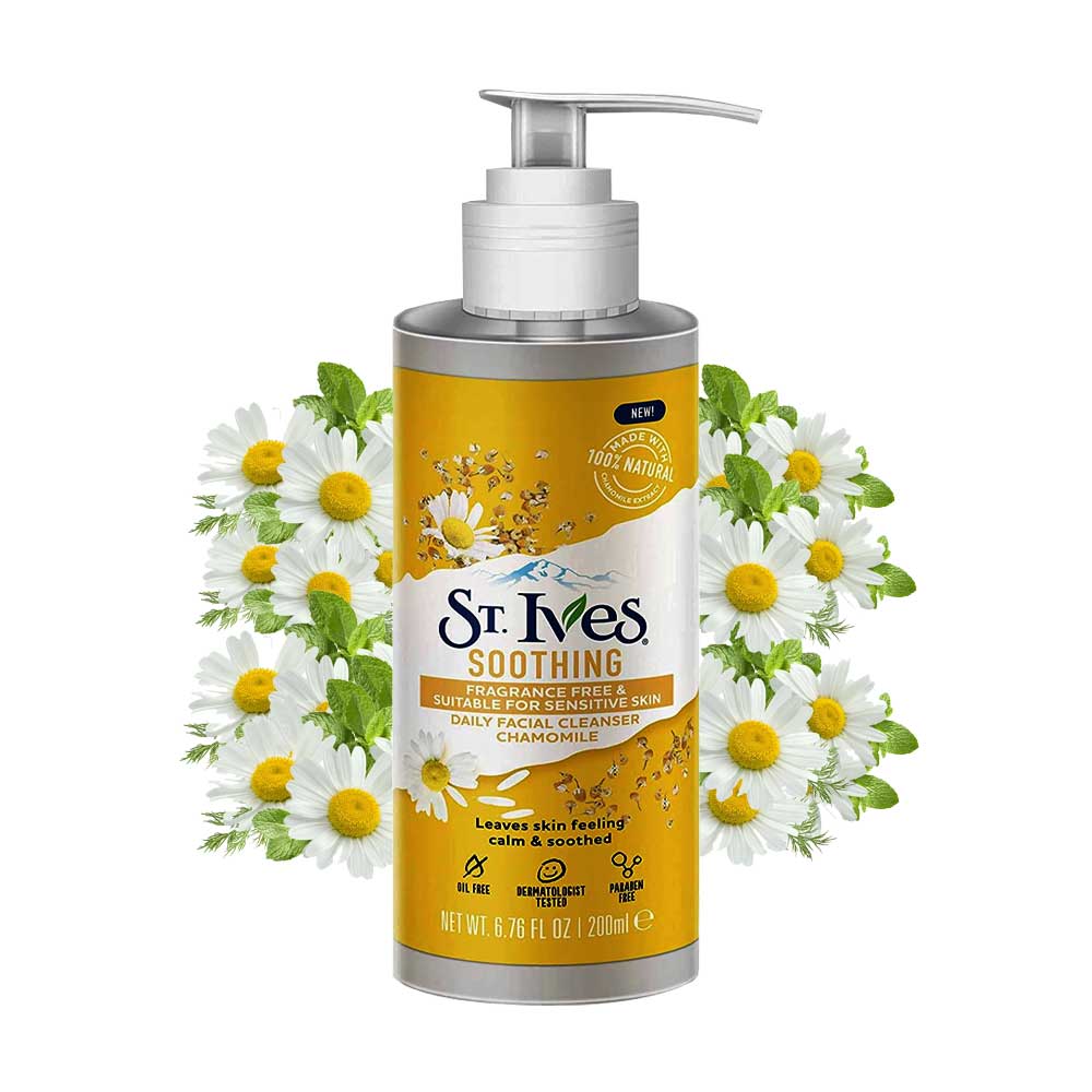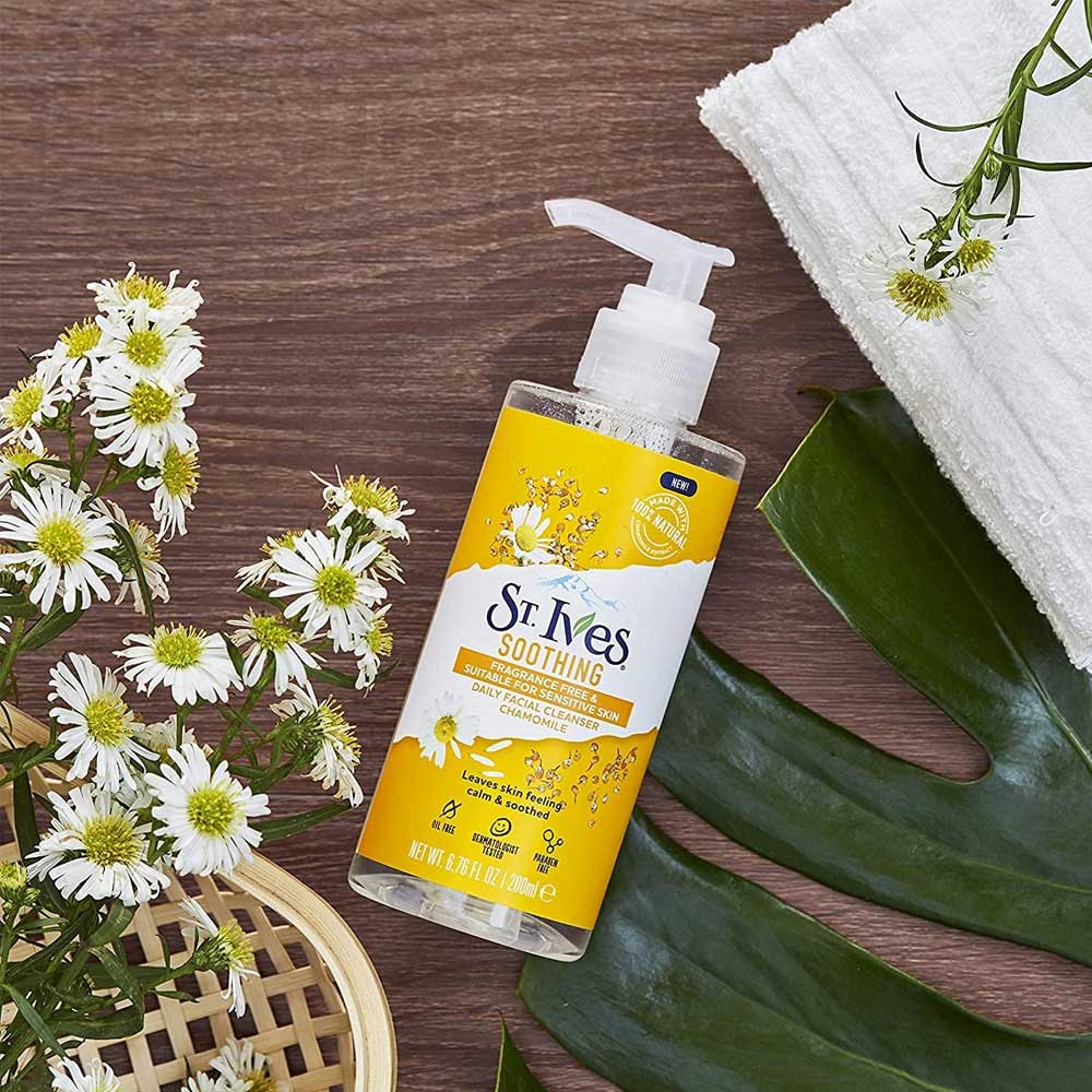 - St Ives Soothing Chamomile daily Facial Cleanser is fragrance free and suitable for sensitive skin.