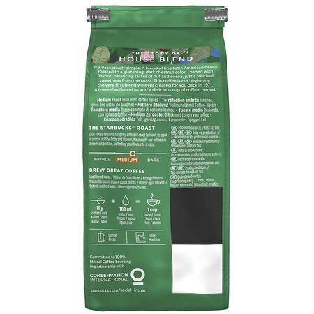 - Rich with toffee notes, STARBUCKS House Blend Medium Roast Ground Coffee, ready to brew Aroma, body and flavour all in balance with tastes of nuts and coca