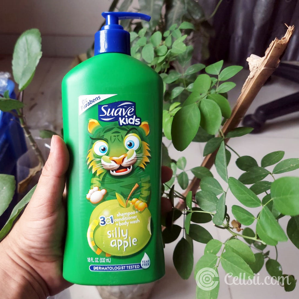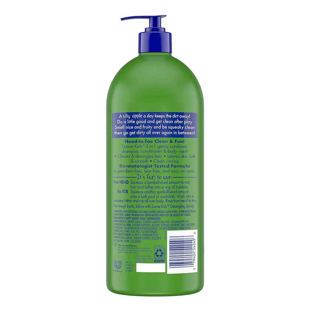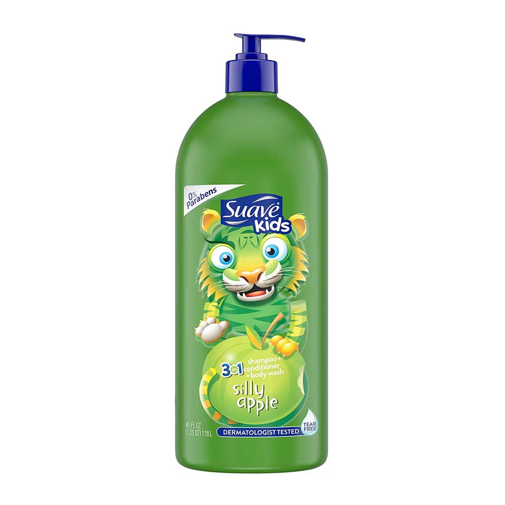 - Suave Kids Silly Apple 3-in-1 shampoo, conditioner and body wash packs a triple punch of fruity clean in one deliciously simple step.
