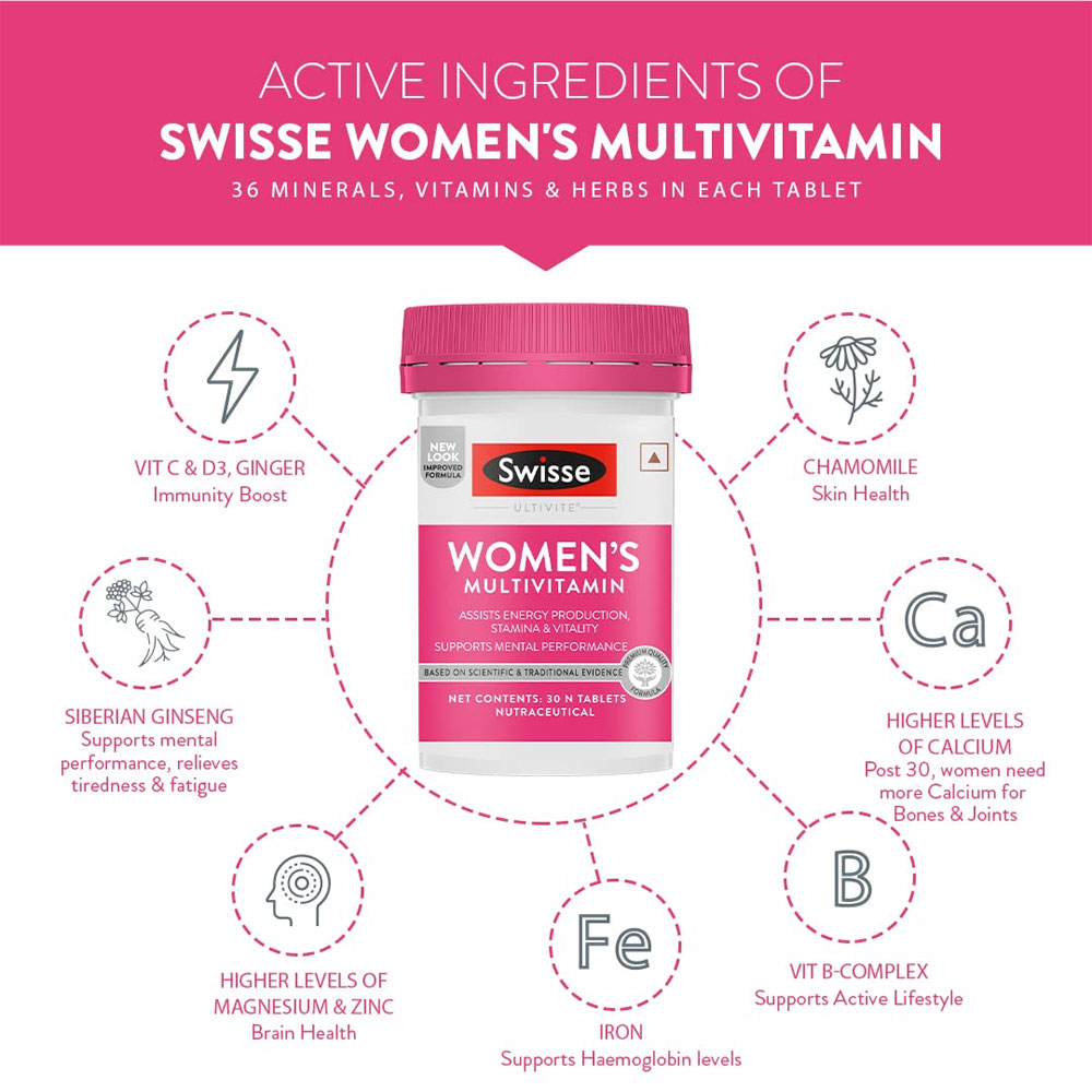 Buy Swisse Ultivite Women's Multivitamin 30 Tablets online in Bangladesh from Cellsii.com. Whatever your reason for seizing each day, Swisse Ultivite Women’s Multivitamin can help support you on the path to achieving your goals. This premium quality formula supports immune health, energy production, and helps relieve fatigue. It's scientifically tailored for women and includes ashwagandha.